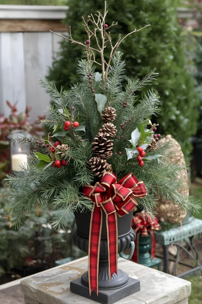 Fill outdoor planters with pine branches, holly, red berries, pinecones, or faux snow. Add a bow or miniature ornaments for extra flair.