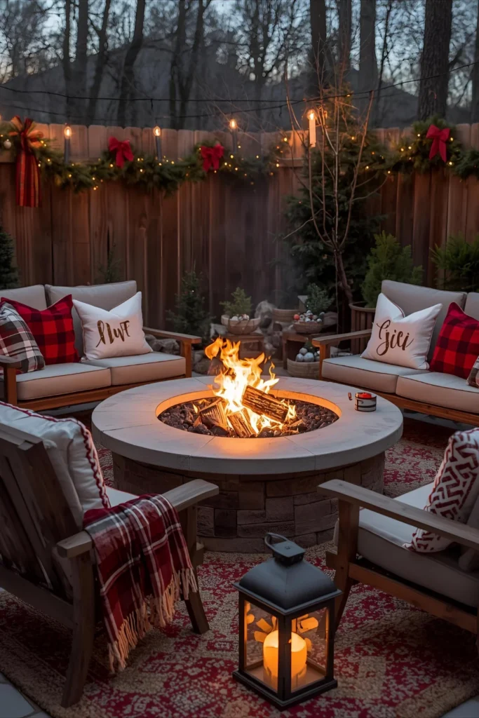 Decorate your fire pit area with holiday pillows, chunky blankets, lanterns, and warm beverages. Add a small garland or wreath nearby for a festive touch.
