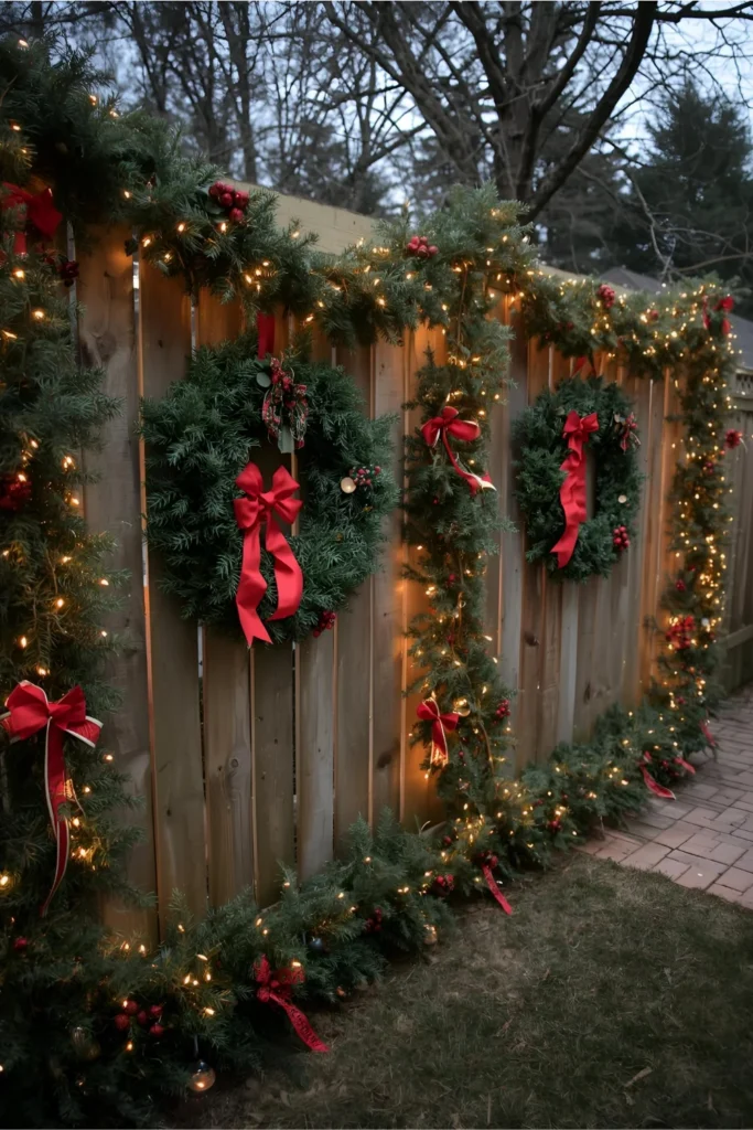 Dress your backyard fence with Christmas wreaths and lush garlands. Add bows or fairy lights for extra charm.