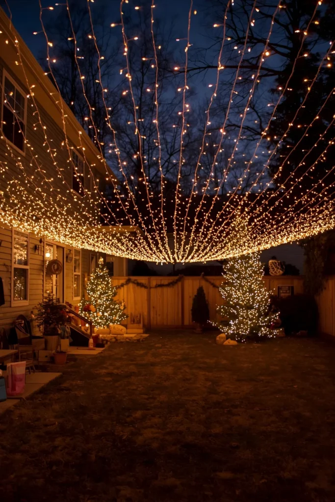 This idea works beautifully because it creates movement and atmosphere instantly transforming your backyard into a winter wonderland.