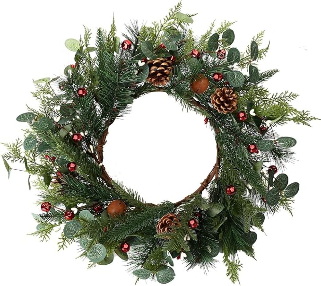 For those who prefer a minimalist or natural look, greenery and pinecones make a beautiful combination. Bundle eucalyptus sprigs, evergreen branches, and pinecones into simple swags, then hang them vertically on your door or across your garland.