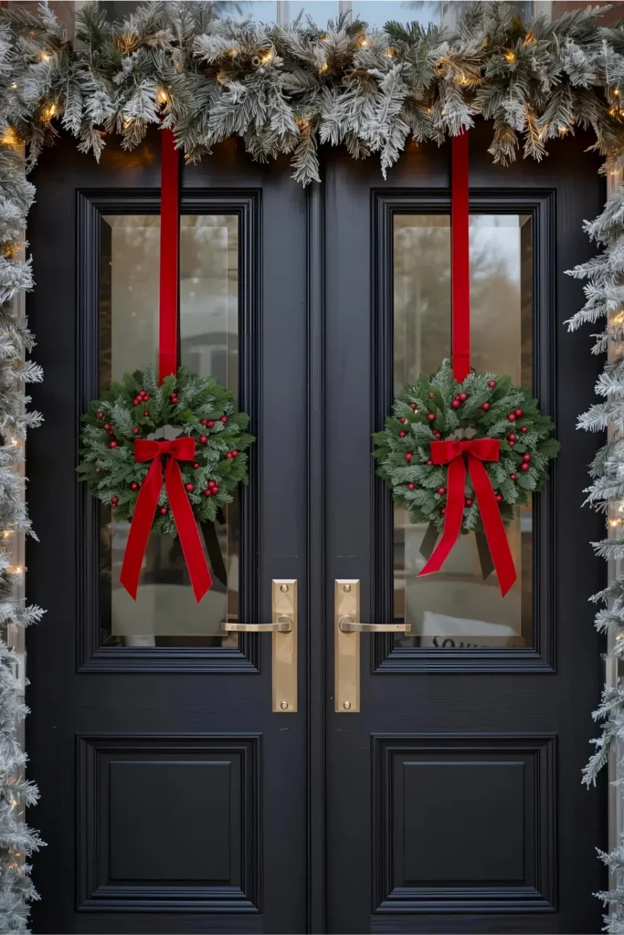 If your entryway has double doors or windows, hanging matching mini wreaths creates a symmetrical and polished appearance. Use thin velvet ribbons in red or gold to hang them evenly.