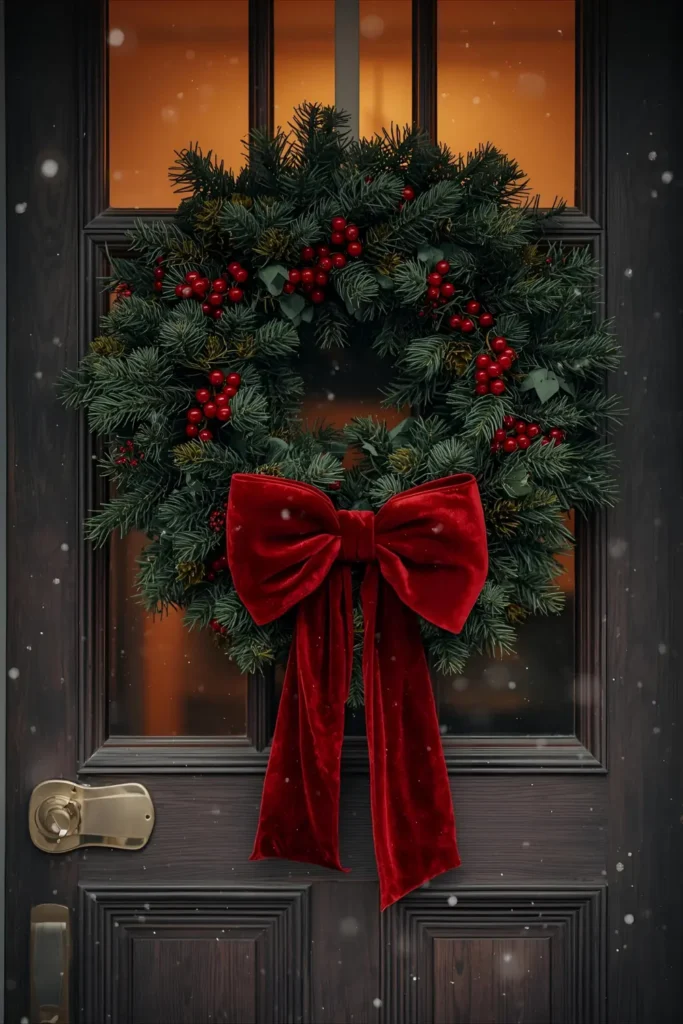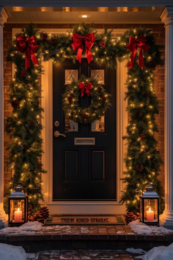 A timeless Christmas wreath never goes out of style. Choose one made of pine branches, holly, and red berries, accented with a large velvet bow. This traditional touch instantly adds warmth and character to any front door. You can also mix in pinecones, cinnamon sticks, or faux snow for an extra seasonal twist.
