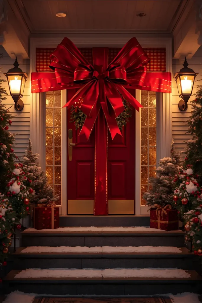 Turn your door into a life-sized Christmas present by wrapping it with red or gold ribbon and adding a big bow in the center. This playful and bold idea brings out the fun side of Christmas decor.