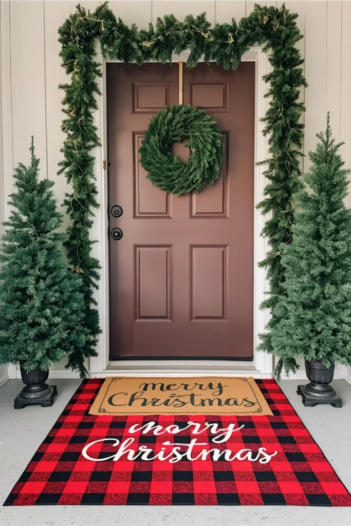 Your door decor isn’t complete without the perfect welcome mat! Start by layering a red-and-black buffalo plaid rug under a “Merry Christmas” doormat. This layered look adds warmth and visual depth while instantly making your entrance photo-worthy.