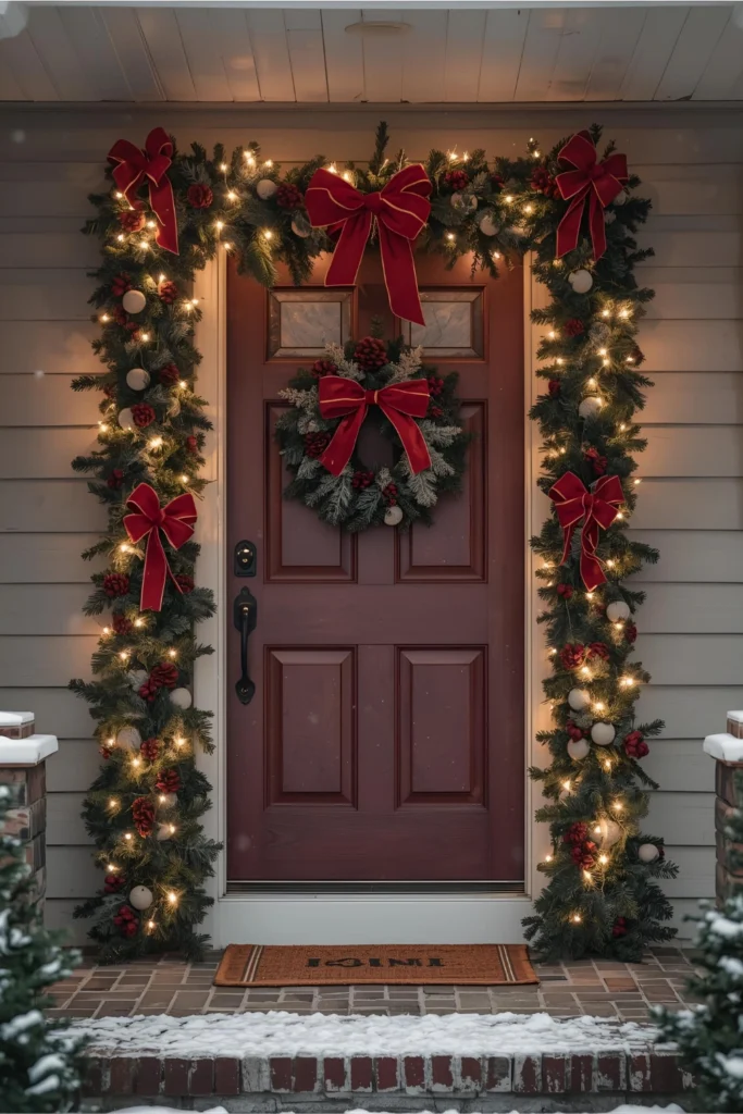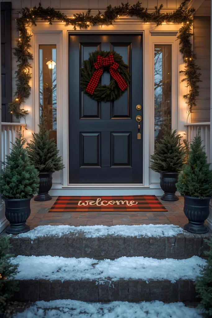 A timeless holiday look starts with lush evergreen garlands draped around the doorway, wrapped in warm white lights. Add matching mini trees on each side of the entry to frame your porch with natural winter beauty.