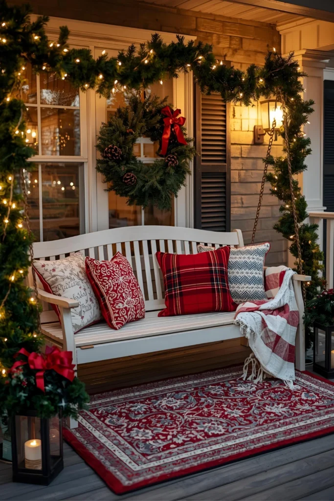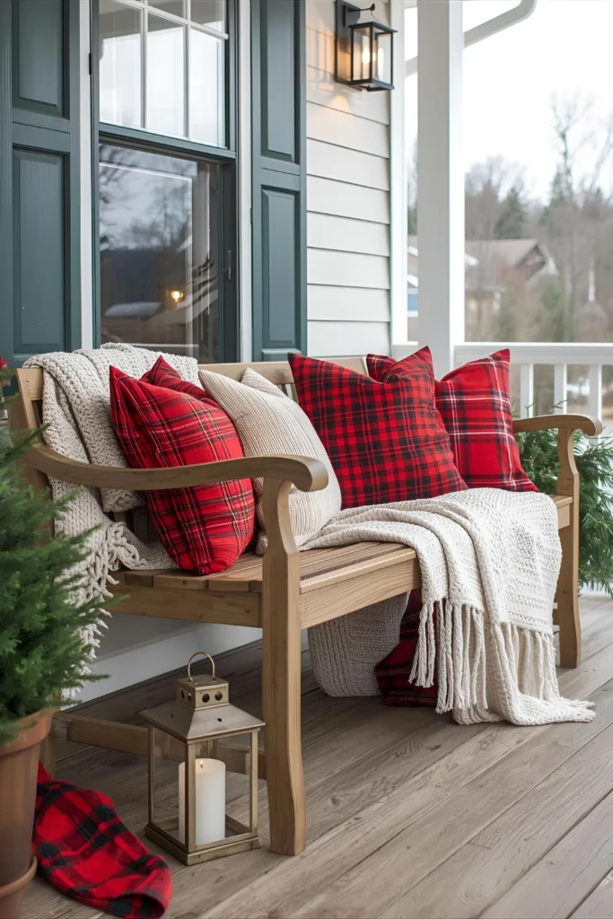 Buffalo plaid has become a Christmas staple and it looks perfect on a front porch. Think plaid doormats, ribbon bows, porch pillows, or even wrapped gift boxes stacked near the door.