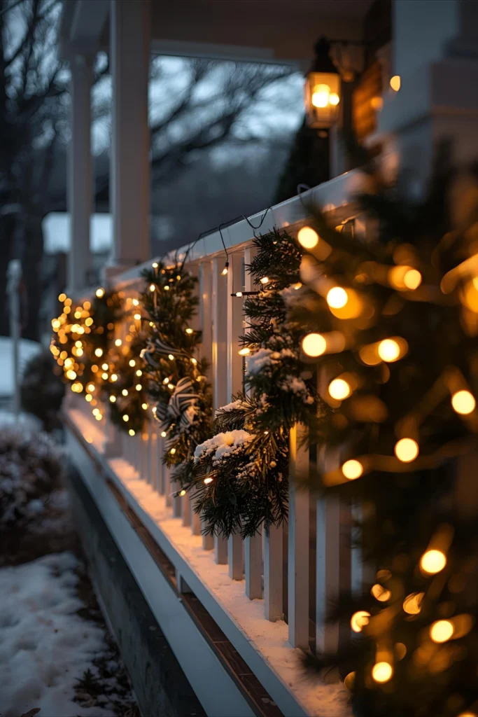This setup works because greenery adds instant warmth and fullness, while lights create a magical glow at night. If your porch is narrow, go for slim or sparse garlands that still look festive without overwhelming the space.