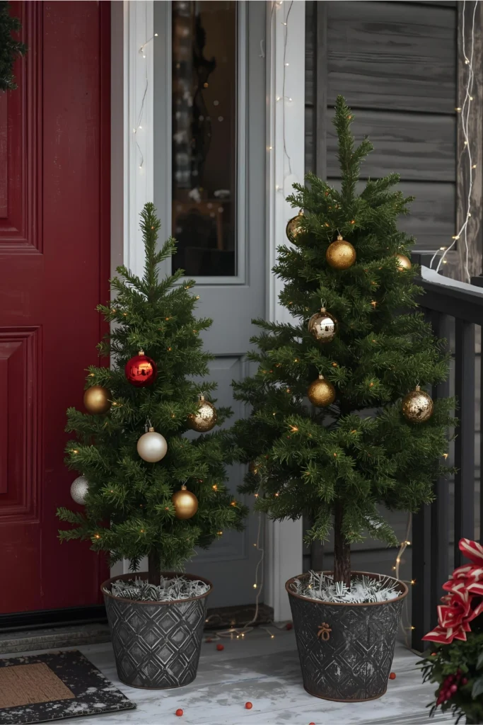 Decorate your front porch with several small Christmas trees mixing real potted evergreens and artificial minis. Add lights, bows, or leave them natural for a Scandinavian-inspired vibe.