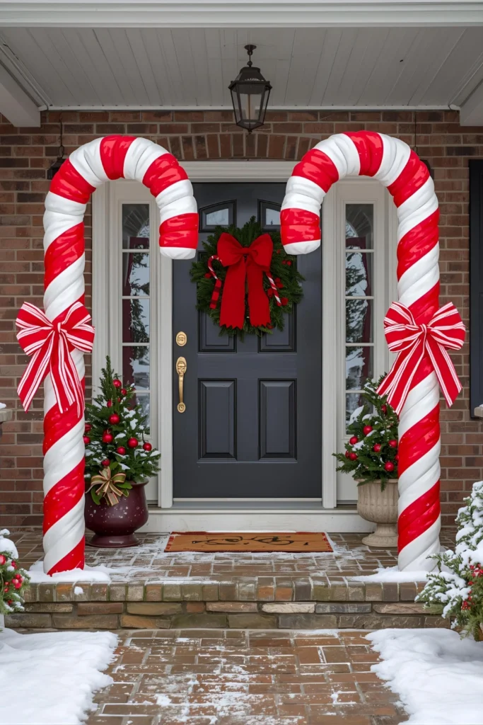 A large Christmas wreath filled with pinecones, berries, ornaments, and ribbon instantly anchors your porch décor. Whether classic green, flocked white, or red-themed, a well-designed wreath sets the holiday mood.