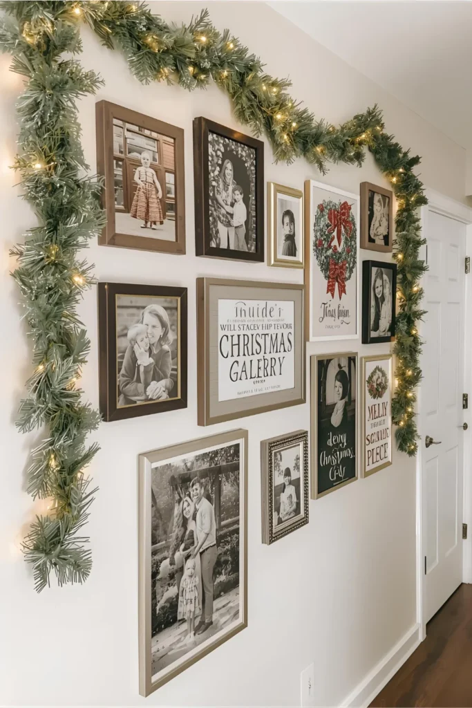 Turn a blank wall into a festive display! Replace a few existing frames with holiday prints or family Christmas photos. Mix in framed ornaments, snowflake cutouts, or Christmas quotes like “Joy to the World.”