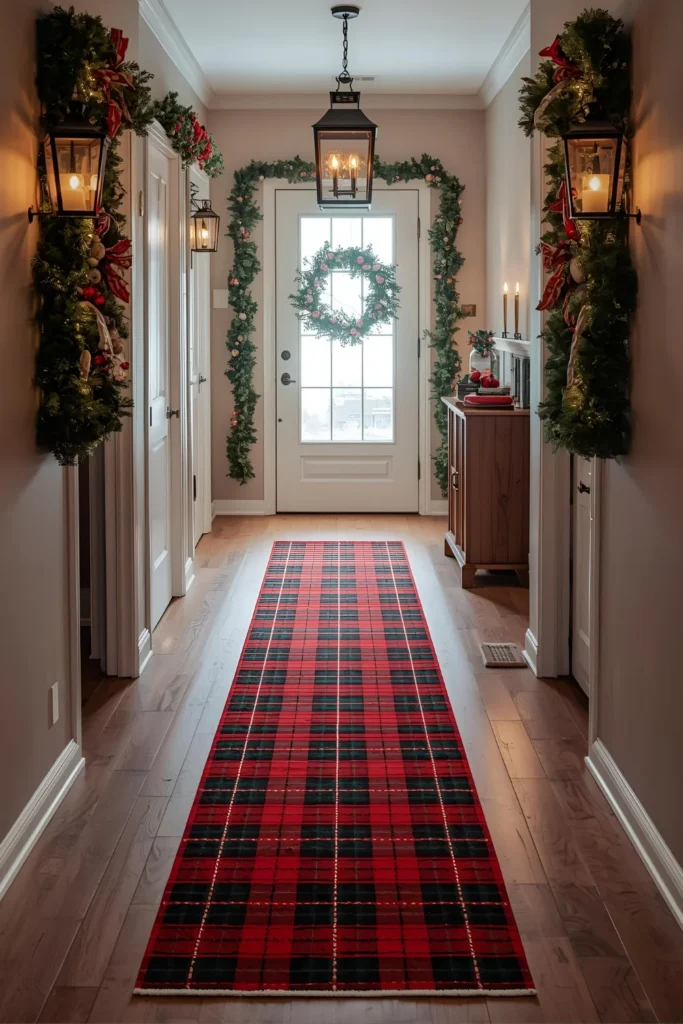 Swap your regular rug for a seasonal runner in red, green, or plaid patterns. It’s an easy change that instantly ties the hallway together and adds a sense of warmth.