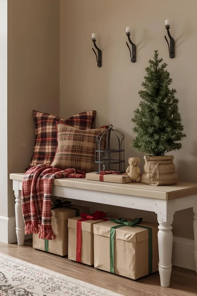 If you have space, place a small bench along the wall and style it with plaid cushions, throw blankets, and a few wrapped “gift” boxes underneath. It not only looks inviting but also adds functionality during the holidays.