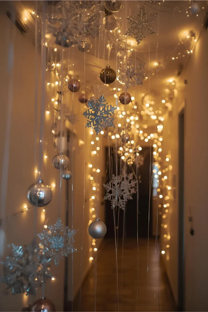 Suspend ornaments or snowflakes from the ceiling using clear fishing wire. It gives a whimsical floating effect that’s perfect for adding personality to narrow spaces.