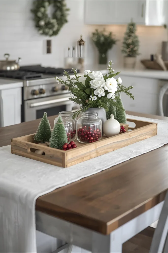 Your kitchen island is the centerpiece make it shine! Create a simple holiday vignette using a wooden tray, a few mini trees, and a vase filled with cranberries and white flowers. Add texture with a runner or faux snow fabric. This little setup adds instant holiday cheer without cluttering your prep space.
