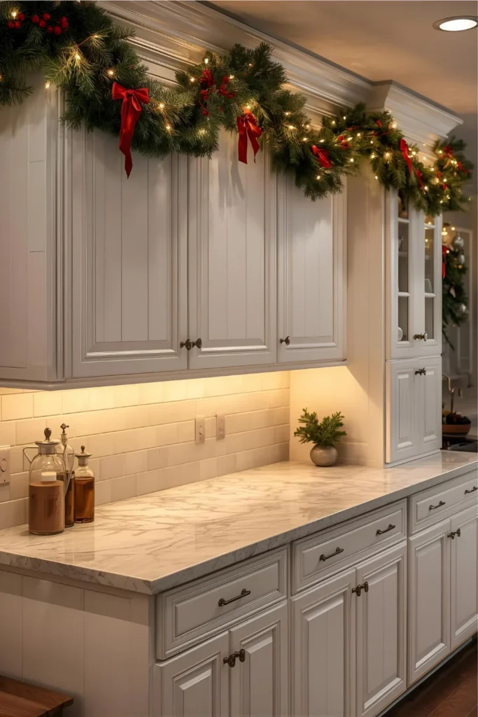 1. Add a Festive Garland Above the Cabinets
