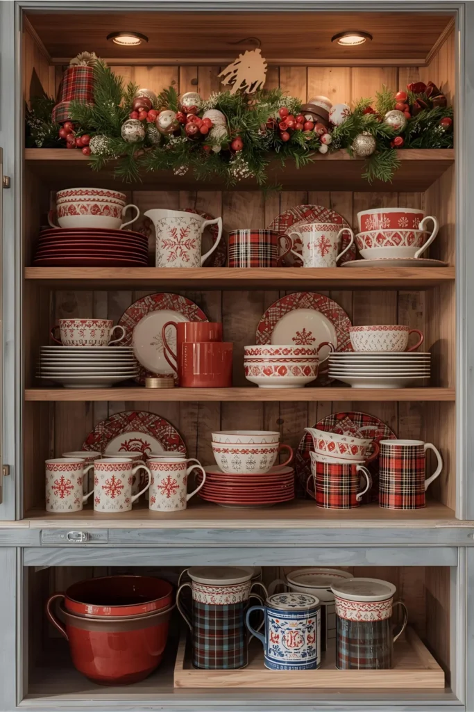Bring out your Christmas mugs, plates, and serveware! Display them on open shelves or glass-front cabinets for a cheerful, lived-in look.