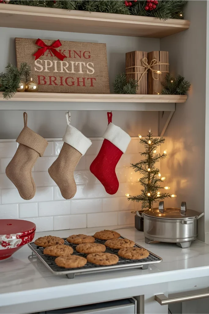 If your kitchen has open shelves or a mantle-style range hood, hang small stockings or festive wooden signs that say “Baking Spirits Bright” or “Santa’s Snack Station.” This adds a playful, personal touch especially if you have little ones. You can even assign a stocking to each family member for a sweet surprise-filled countdown to Christmas.