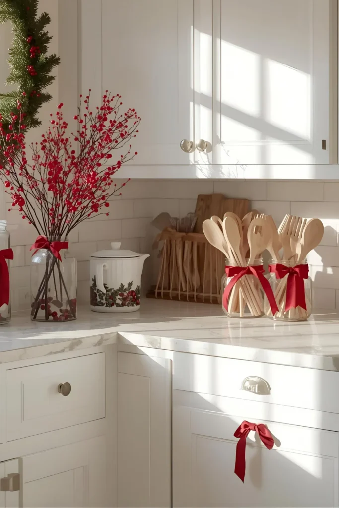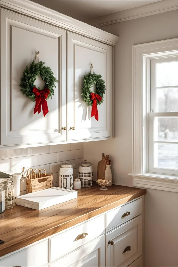 Attach them with red velvet ribbon or elegant satin bows. The symmetry and repetition make your kitchen feel polished, festive, and photo-ready.