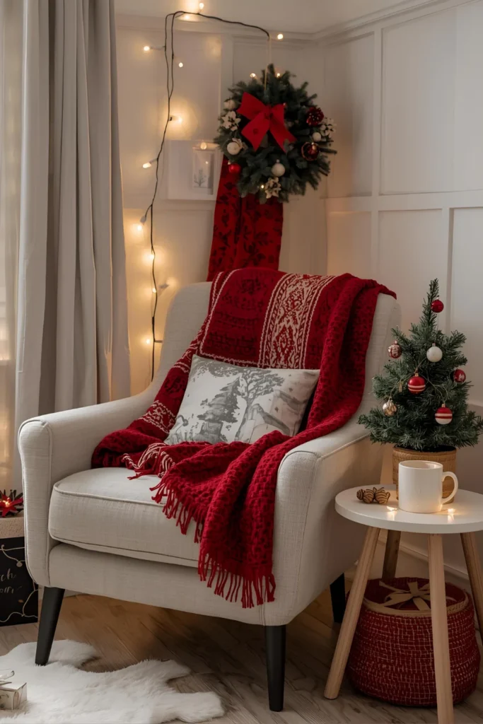 Design a cozy Christmas corner maybe with a small tree, a soft chair, and twinkling lights. Add a blanket, a cup of cocoa, and your favorite holiday book for the perfect winter retreat.
