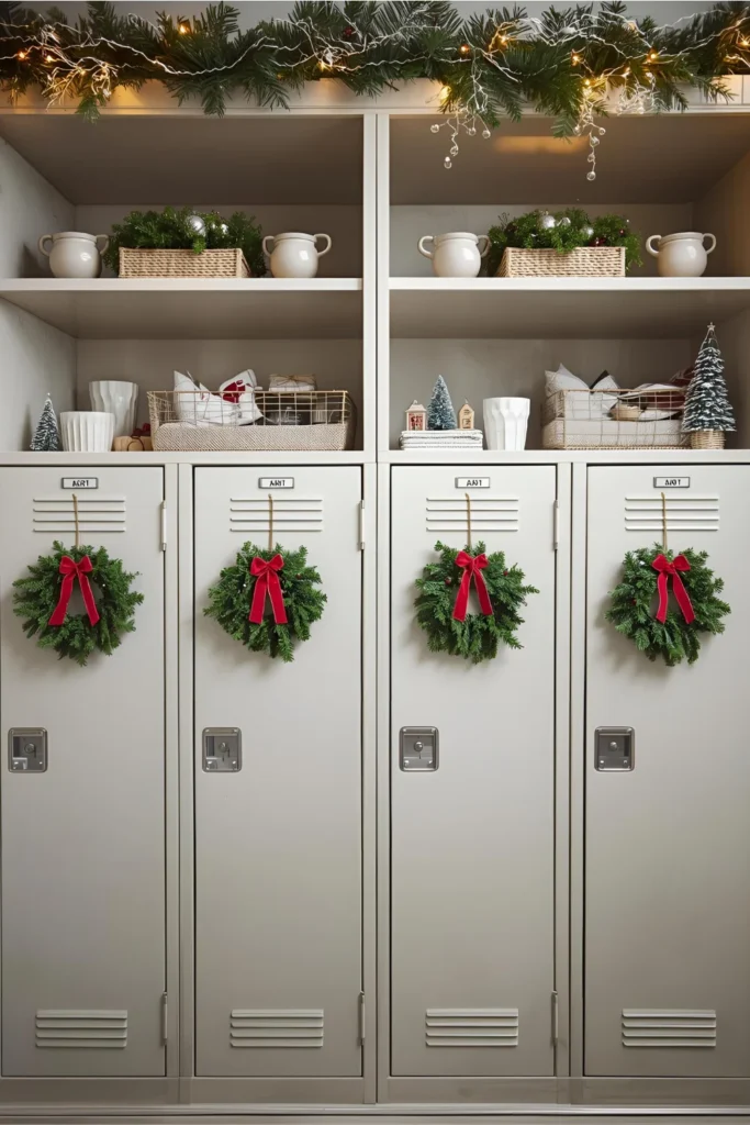 If your mudroom has cubbies or lockers, give them a holiday makeover. Add small wreaths on locker doors, tiny hanging ornaments, or a strand of micro fairy lights across the upper shelf.