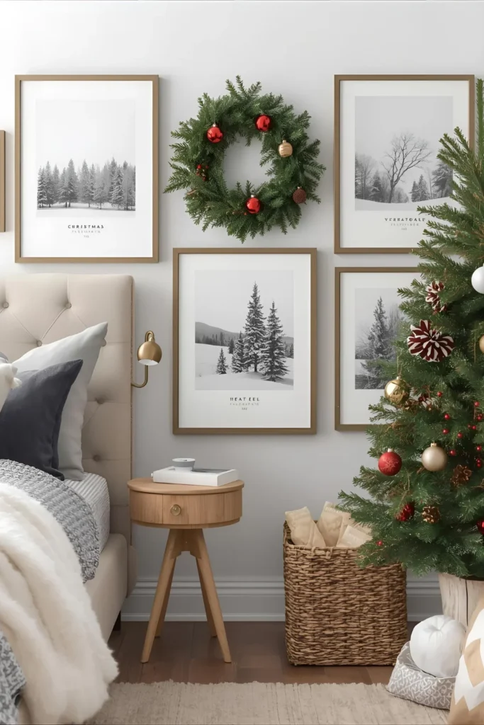 Swap out your usual entryway artwork for holiday prints such as winter landscapes, vintage Christmas illustrations, or modern minimalist holiday quotes.