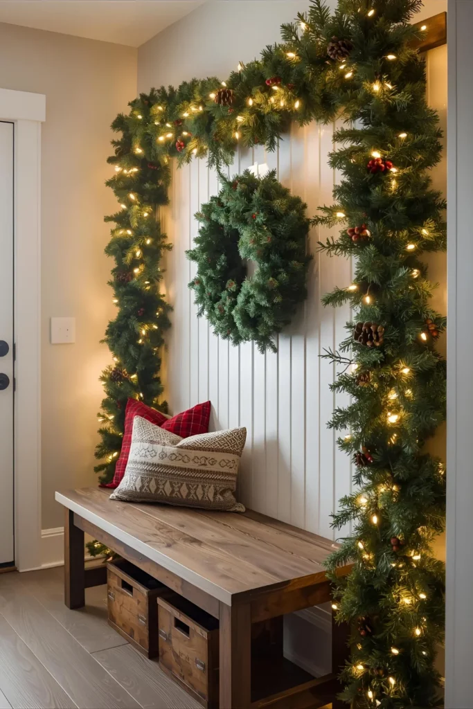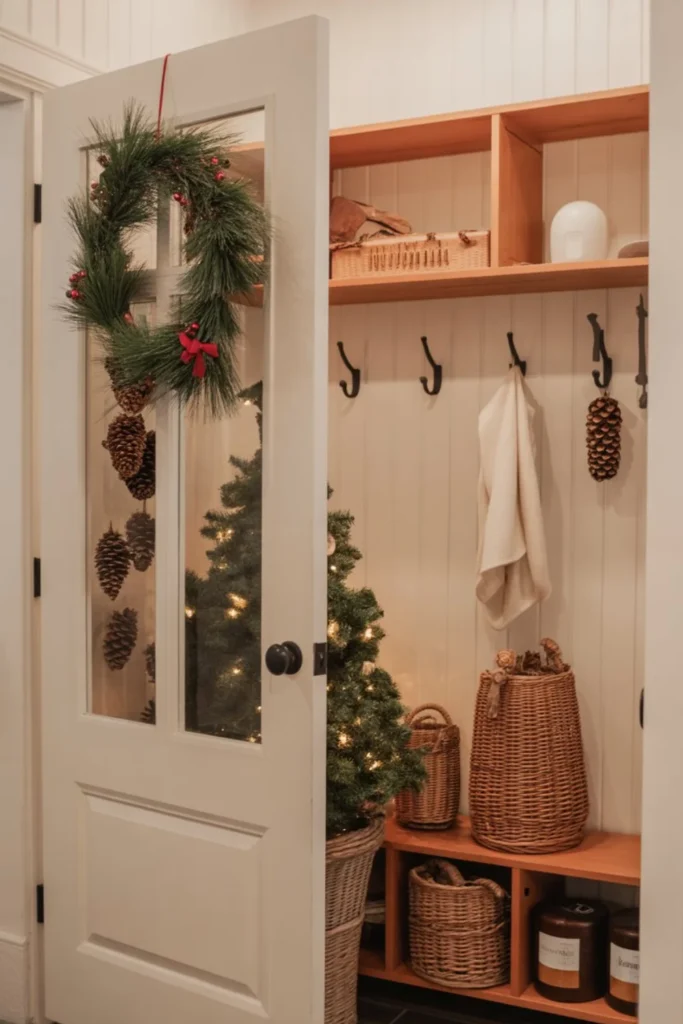This look works beautifully because it frames the space and makes even a small mudroom feel warm and seasonal. You can keep it classic with pinecones or go glam with red berries and gold ribbon.