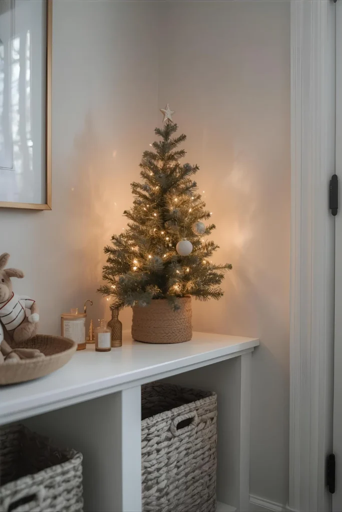 A mini tree works because it brings the holiday spirit into even the narrowest mudroom. Decorate it with tiny ornaments, ribbon, or warm fairy lights for a soft glow every time someone walks in.