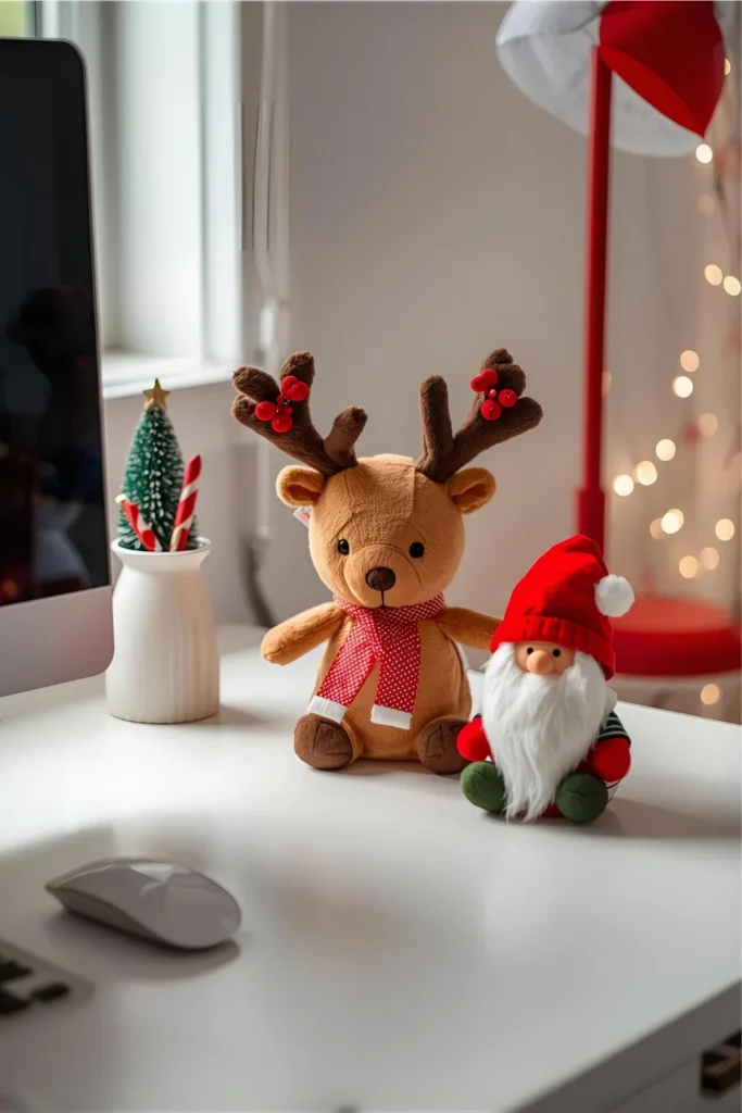 A tiny reindeer, Santa figure, snowman, or Christmas gnome instantly makes your desk feel cheerful. Choose one small plush or figurine so it stays cute not cluttered.
