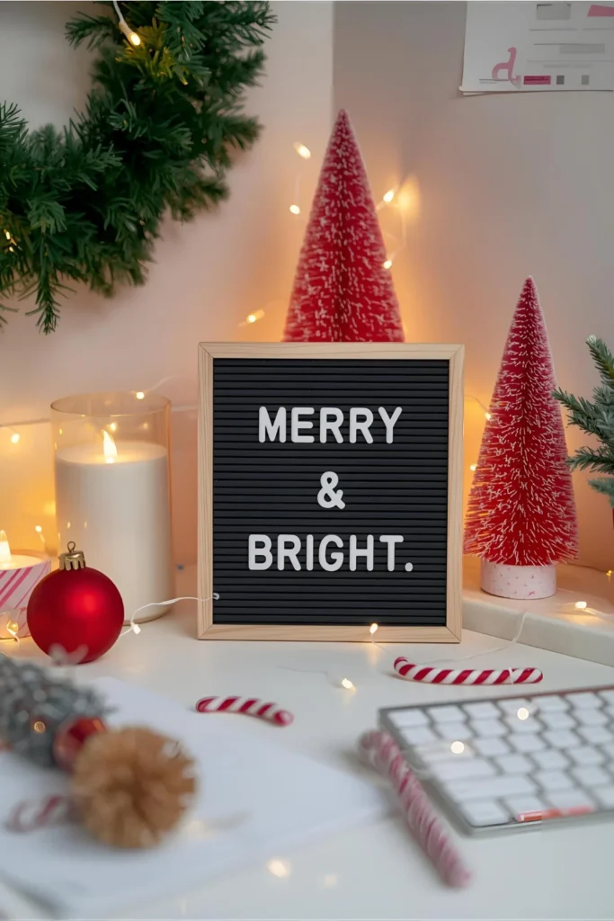 Add a small holiday quote like “Merry & Bright,” “Work with Joy,” or “Holiday Mode Loading…” using a mini sign or felt letter board.