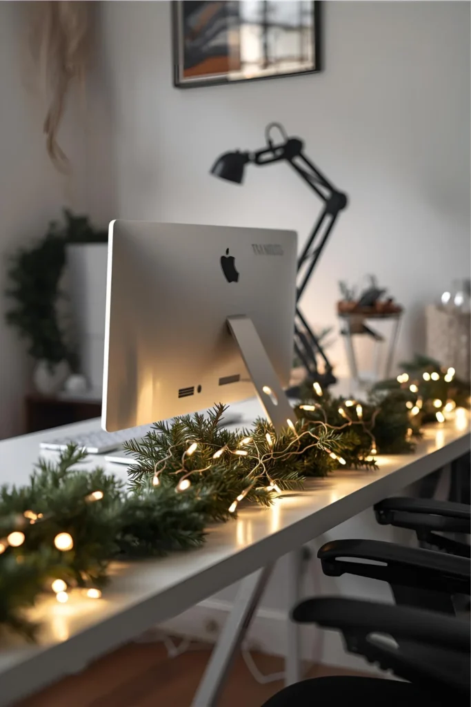 A simple greenery garland draped along the back of your desk or across a monitor stand creates an instant holiday upgrade. Add battery-operated fairy lights for a soft, cozy glow.
