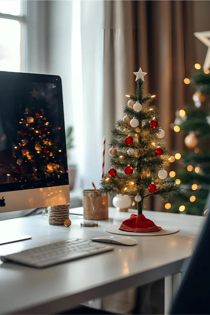 Choose tiny ornaments, warm fairy lights, and a small tree skirt to complete the look. Place it beside your monitor or in a corner where it won’t interfere with your workspace.