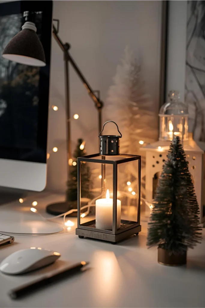 Place a tiny lantern on the corner of your desk and add a flameless candle for a subtle holiday glow. It feels cozy without being overwhelming.