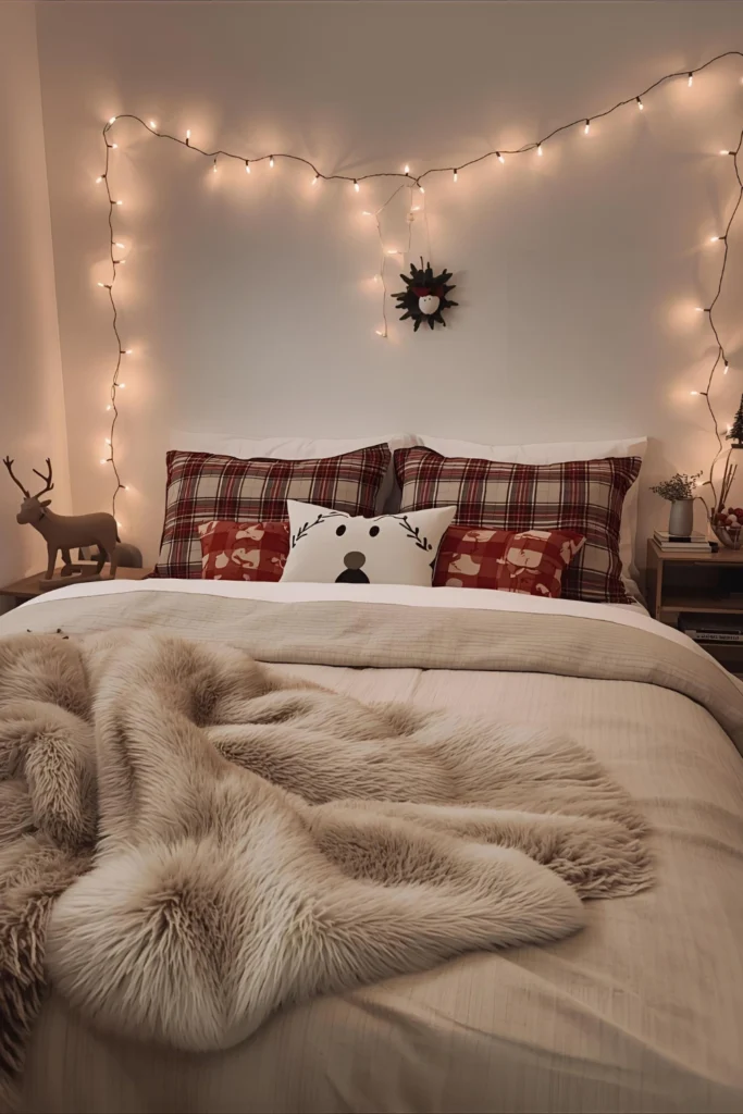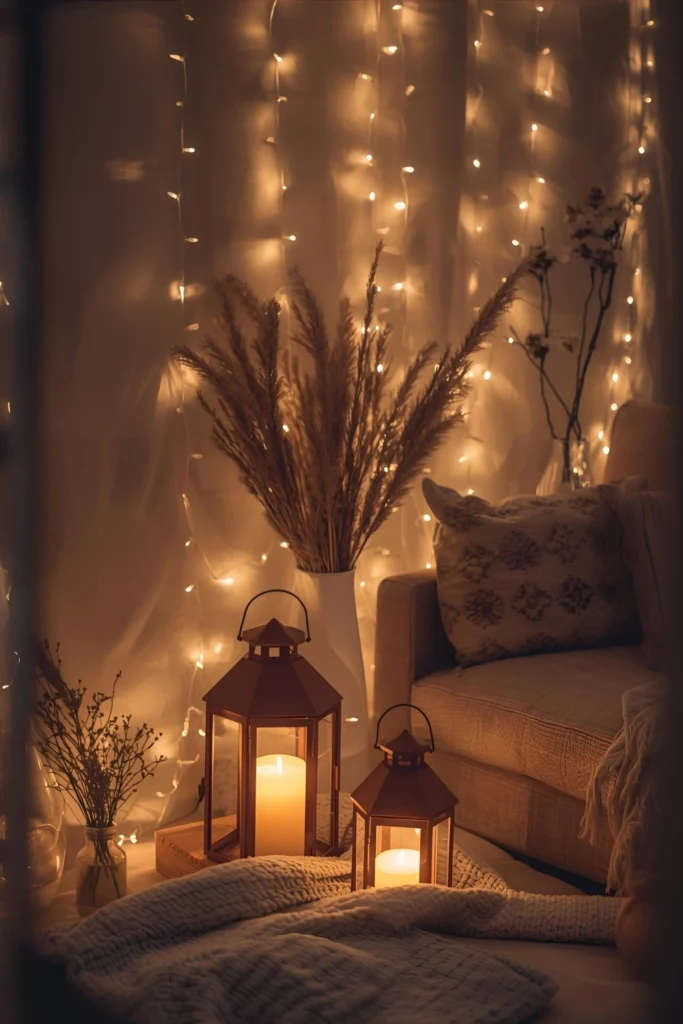 Lighting plays a major role, especially in small apartments. Use warm micro-fairy lights along your headboard, window frame, or wall grid. Add one or two lanterns filled with candles or battery LED candles for a magical winter glow.