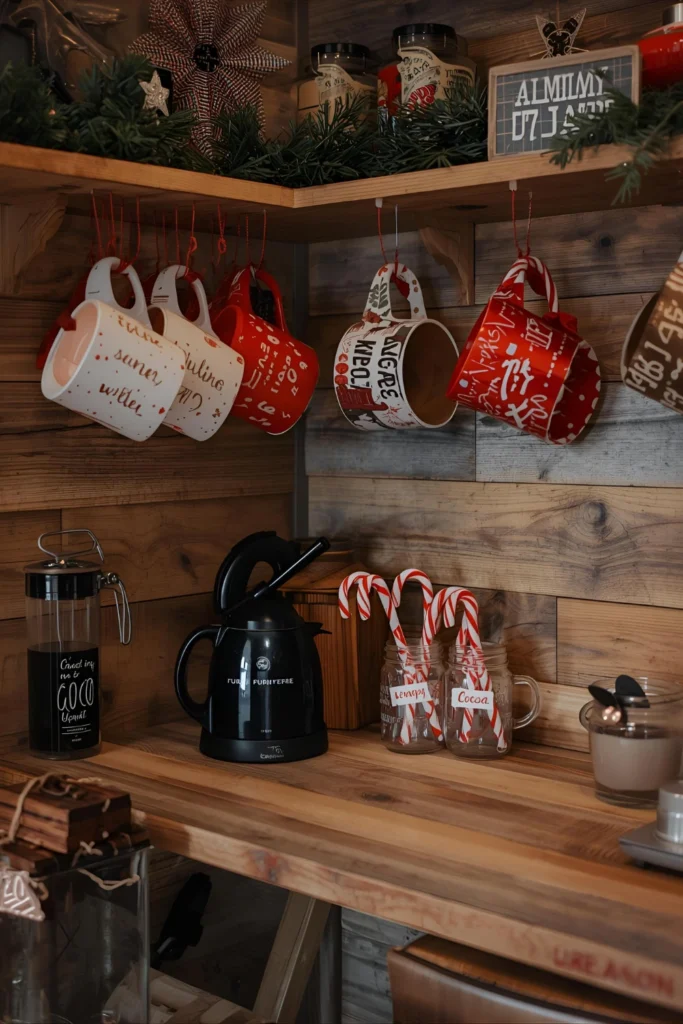 Whether it’s a tiny coffee station or a kitchen counter corner, a tiny festive setup can bring big cheer. Think holiday mugs, candy canes, cocoa mix jars, mini gingerbread houses, and a tiny Christmas sign.