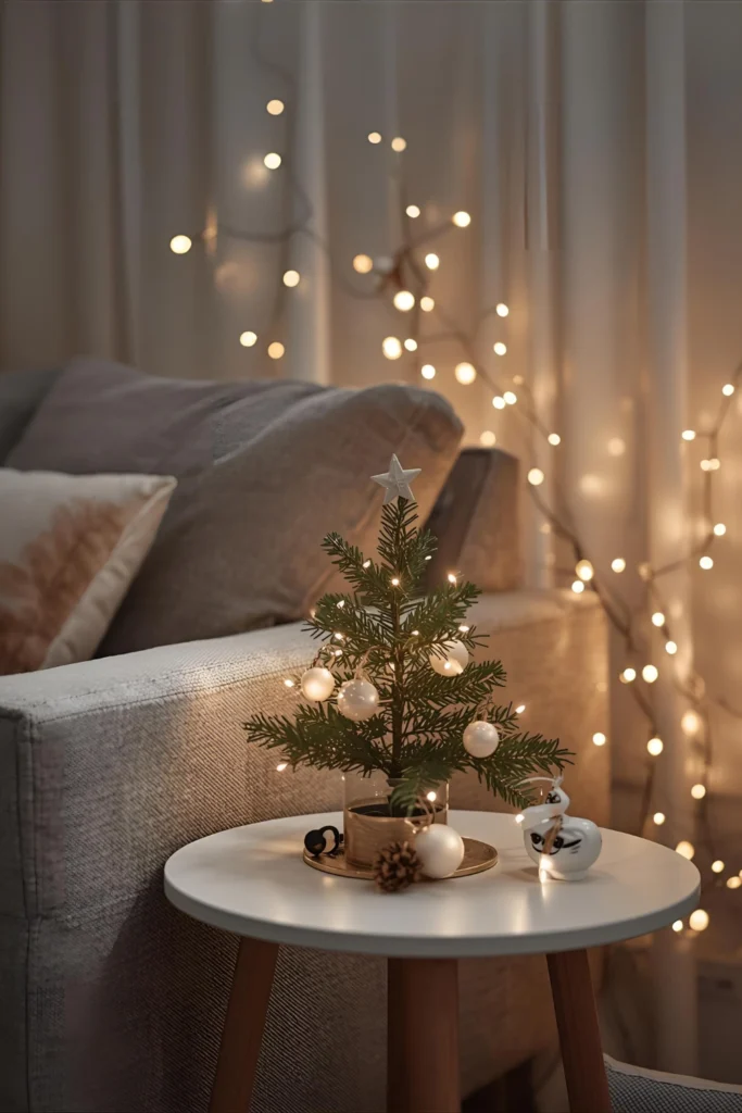 A full-sized Christmas tree can take over floor space, so a small tabletop tree is the perfect alternative. Imagine a 2–4 foot tree placed on a side table, console, or entry cabinet decorated with twinkling fairy lights, mini ornaments, and a small tree skirt.