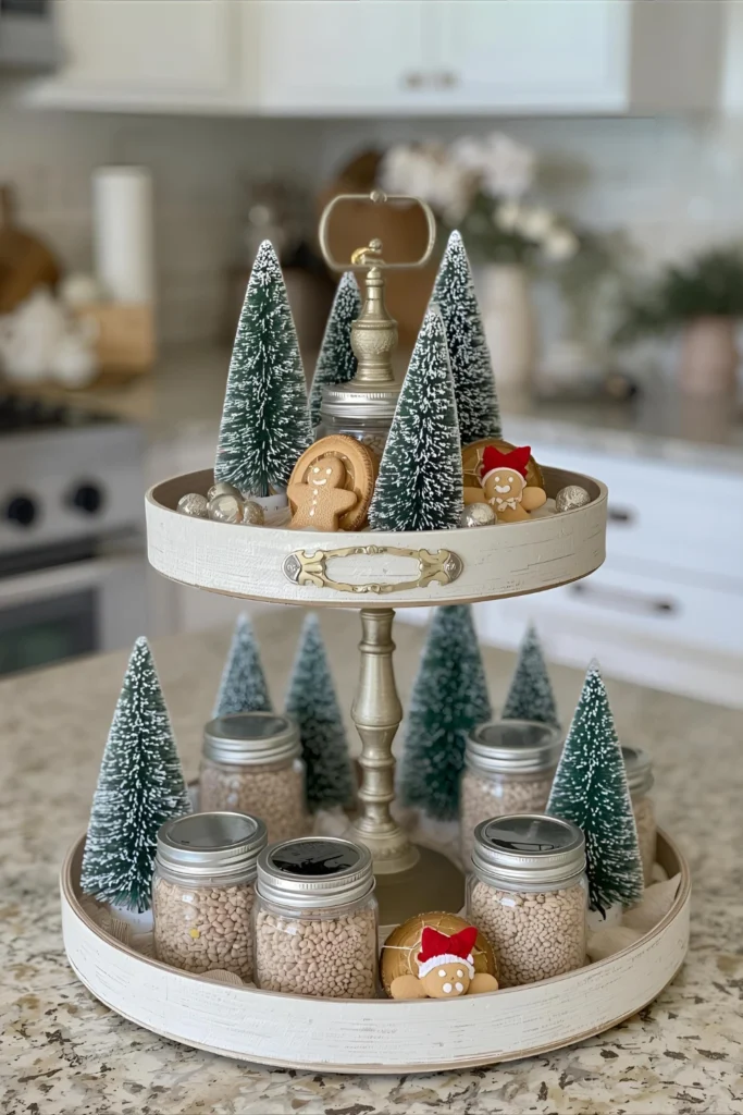 Tiered trays are trending because they allow multiple layers of decor using very little space. You can fill it with mini trees, mugs, Christmas cookies, tiny figurines, cocoa jars, cinnamon sticks, or bells.
