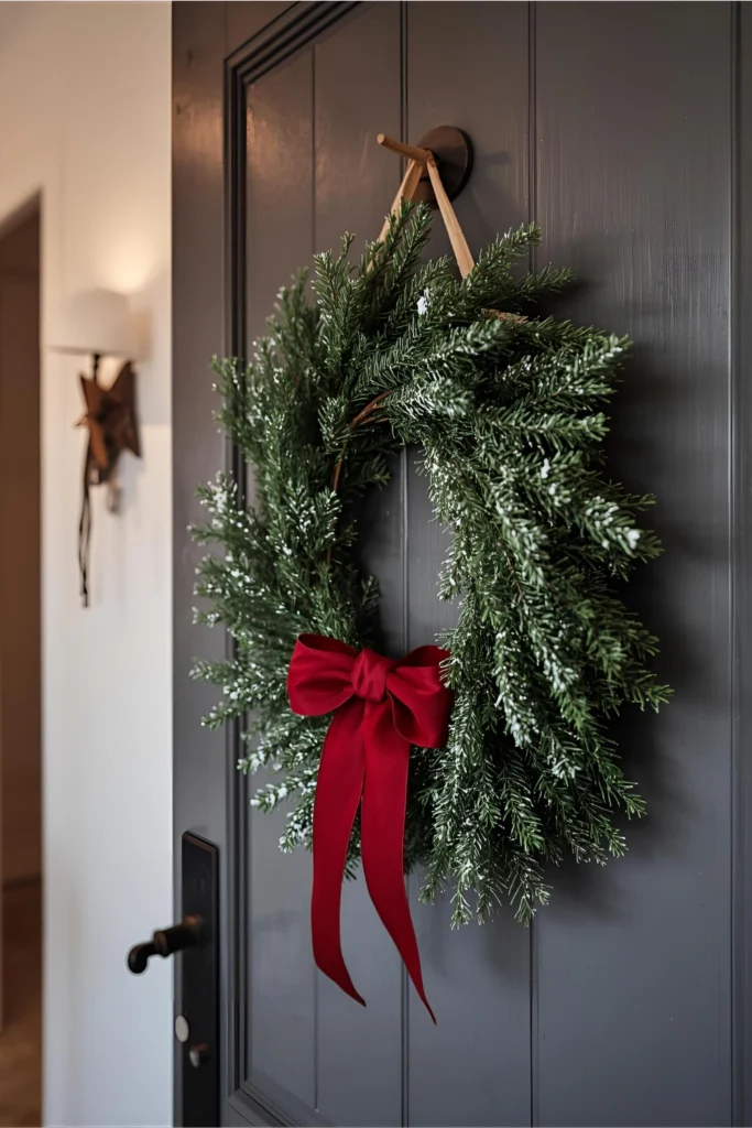 If you can’t decorate with floor decor, go vertical on doors and walls. Hang a small wreath on your bedroom or bathroom door, or create a wall display using snowflake decals, framed holiday quotes, or macrame mixed with pine accents.